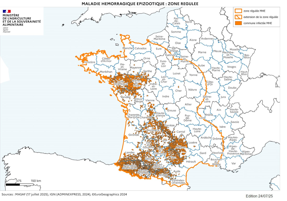 A ce jour (18/08/25), le Rhône n'est pas en zone réglementée MHE. Le foyer le plus proche se situe à plus de 150 km.
