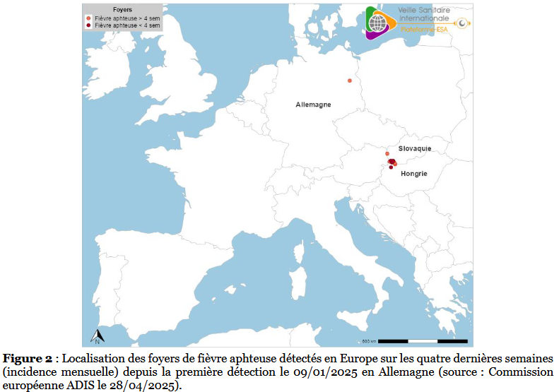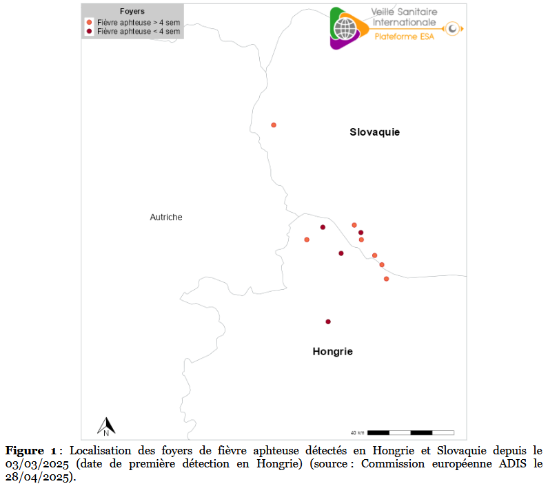 Après 1 foyer déclaré le 10 janvier en Allemagne, le 6 mars la présence du virus de la fièvre aphteuse a été confirmée en Hongrie sur un élevage de 1400 vaches laitières. 3 semaines après, un second foyer de 3000 bovins a été détecté à 40 km. 2 nouveaux foyers ont été détectés le 01/04 dans des exploitations de 1000 et 2500 bovins.