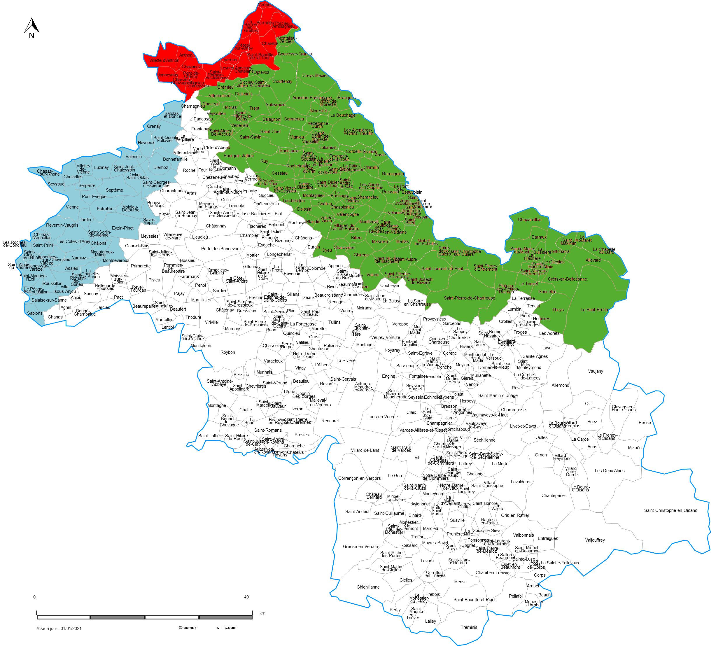 Pour l'Isère, voici le détail des communes en ZV (en vert) pour l'Isère.