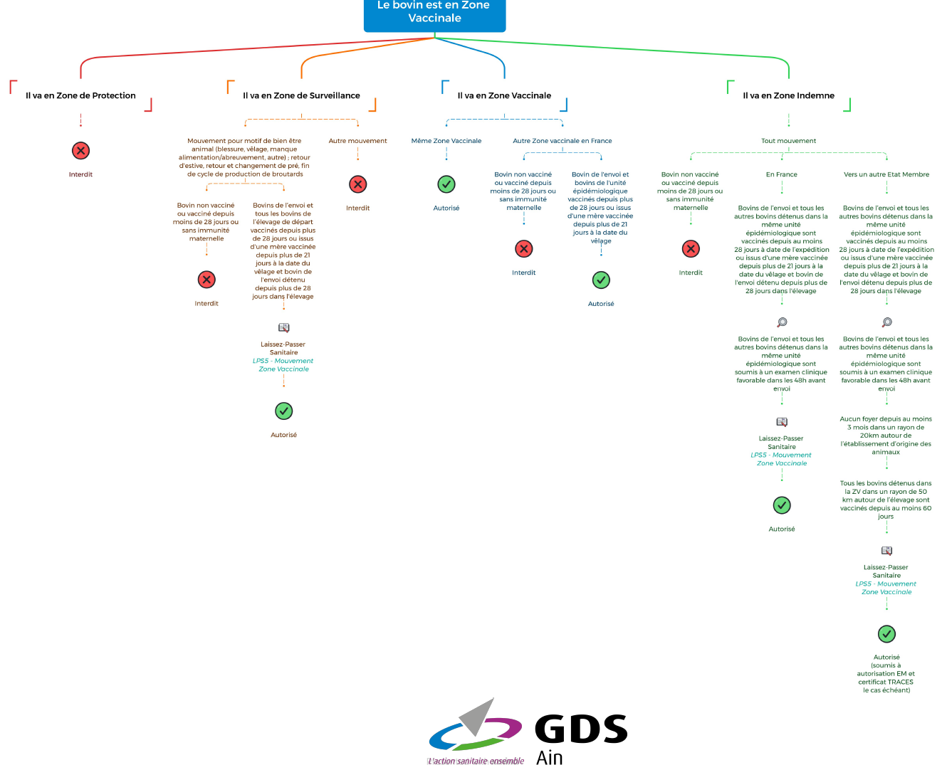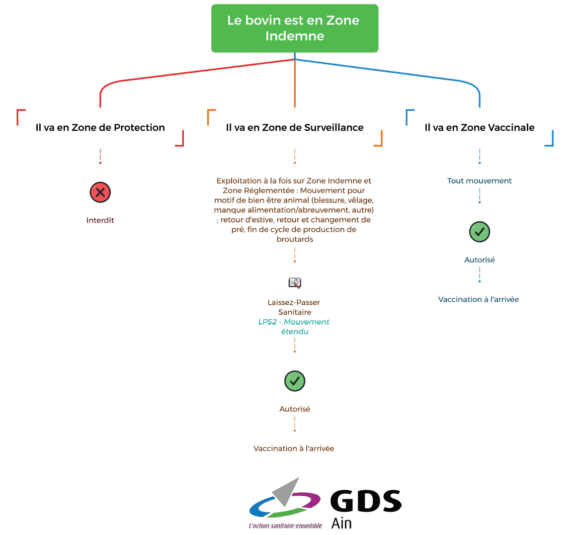 Mouvement élevage depuis la ZI vers la ZV : possible avec vaccination à l'arrivée des bovins tant que la vaccination reste obligatoire.