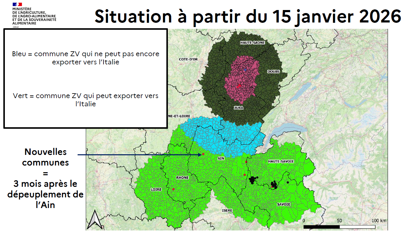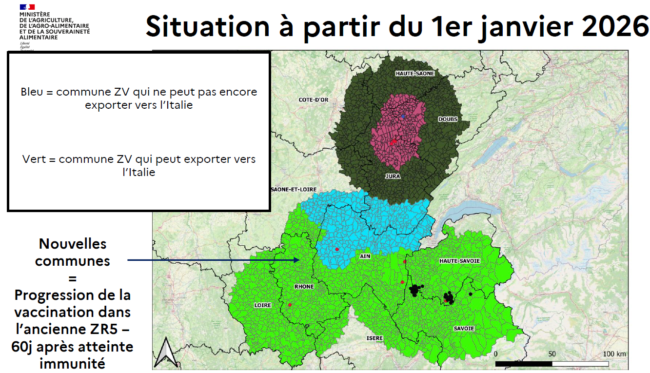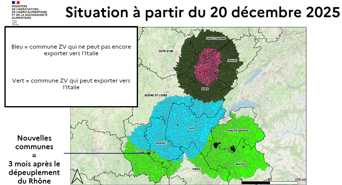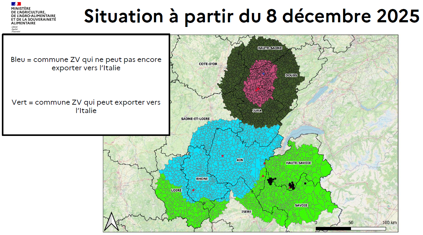 Seules 15 communes de la ZR 1 ont basculé en ZR 5 suite au foyer de l'Ain du 14 octobre et n'ont pas pu sortir de ZR le 22/10/2025.