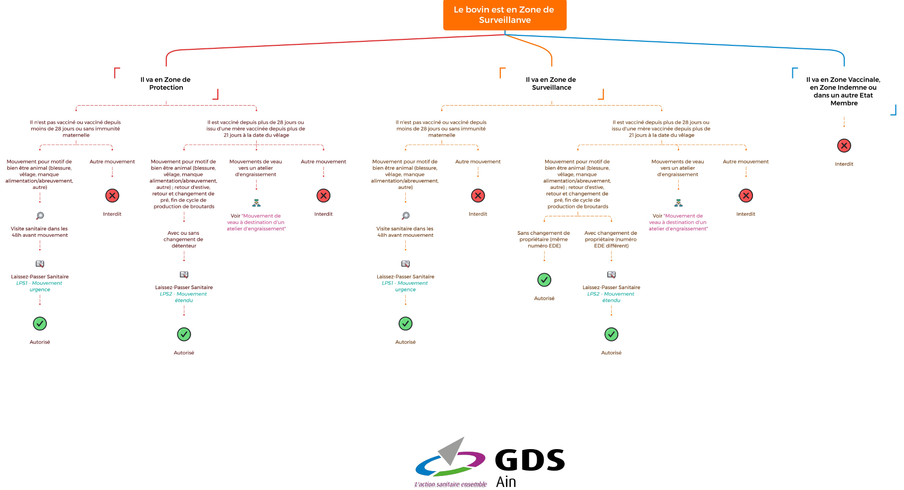 - deux visites vétérinaires (48h avant et à 28 jours) si mouvement vers une zone de statut sanitaire inférieur (SC < ZP < ZS), non requis dans les autres cas