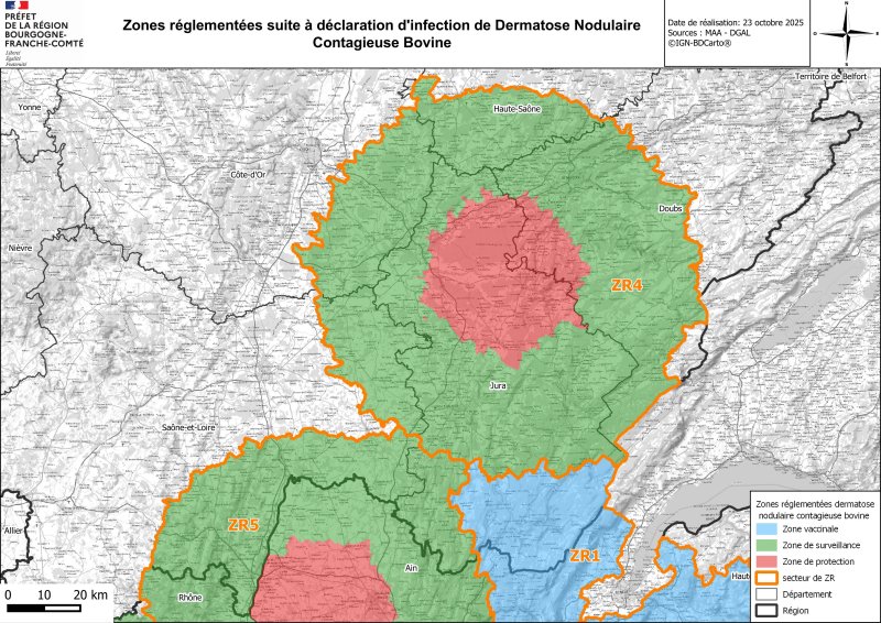 La zone de surveillance inclut des communes d'Occitanie, dans lesquelles la vaccination obligatoire contre la DNC va se mettre en place dans les prochains jours. 9 foyers ont été déclarés au 30/10/2025 dans les Pyrénées-Orientales, élargissant la zone réglementée. Lire le communiqué de presse en cliquant ici. ZR4 (Jura) : Un foyer détecté le 11/10/2025 dans un élevage du Nord-Est du Jura, qui impacte les départements du Doubs, de Côte d'Or, la Haute-Saône et la Saône-et-Loire. 2 autres foyers détectés au 14/10/2025 dans le même village que le premier foyer. Lire le communiqué de presse en cliquant ici. ![]() ZR 5 (Ain) : Un nouveau foyer détecté le 14/10/2025 implique une nouvelle zone réglementée, chevauchant certaines communes de zones réglementées déjà existantes. Ce foyer dans un élevage de veaux est en lien épidémiologique avec un foyer du Jura. |