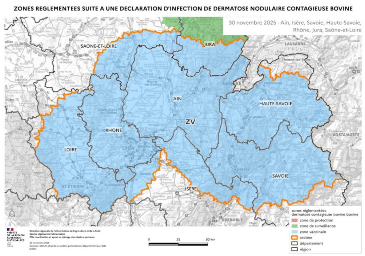 | ACTUALITÉS ÉPIDÉMIOLOGIQUES Un premier foyer de DNC (Dermatose Nodulaire Contagieuse) a été déclaré dans un élevage bovin laitier en Savoie, le 29 juin 2025. Afin d'éviter la dissémination de cette maladie, le cheptel est dépeuplé rapidement, étant donné le statut de cette maladie au niveau européen (catégorie A+D+E au niveau de la LSA). A la date du 02/11/2025, 96 foyers ont été mis en évidence en France. Une zone réglementée d’un rayon de 50 kilomètres est mise en place autour du foyer et instaure des mesures de prévention (surveillance vétérinaire renforcée, vaccination obligatoire), ainsi que des restrictions notamment sur le déplacement des bovins. Ces mesures visent à éviter que la maladie ne se diffuse dans d’autres élevages, en particulier au-delà de cette zone réglementée. ![]() ZR1 (foyers Savoie, Haute-Savoie, Ain) : En l'absence de nouveau foyer depuis 28 jours, les communes en zone de protection de la ZR1 sont passées en statut de zone de surveillance, le 04/10/2025. Le 20/10/2025, la zone vaccinale a été mise en place dans les communes de Savoie et Haute-Savoie, pour permettre des mouvements vers la zone indemnes, sous conditions. Lire le communiqué de presse en cliquant ici. ZR2 (Rhône): Le 18/09/2025, un foyer dans un élevage bovin sur la commune de Saint Laurent de Chamousset, dans le Rhône. ZR3 (Espagne - Occitanie): En Espagne, un premier foyer a été détecté le 01/10/2025 au sein d’un élevage de 123 bovins laitiers, situé dans la commune de Castelló d’Empuries (province de Gérone) à 20 km de la frontière française. Le nombre de foyers espagnol est de 9 élevages, au 16/10/2025.