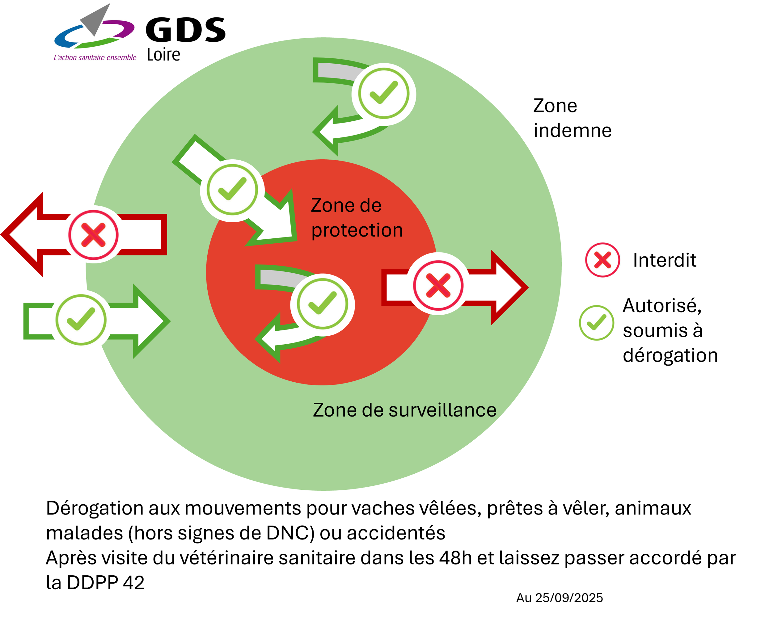 - Zone de protection : mouvement possible depuis la zone de protection vers la zone de protection, uniquement sur des bovins vaccinés depuis plus de 21 jours