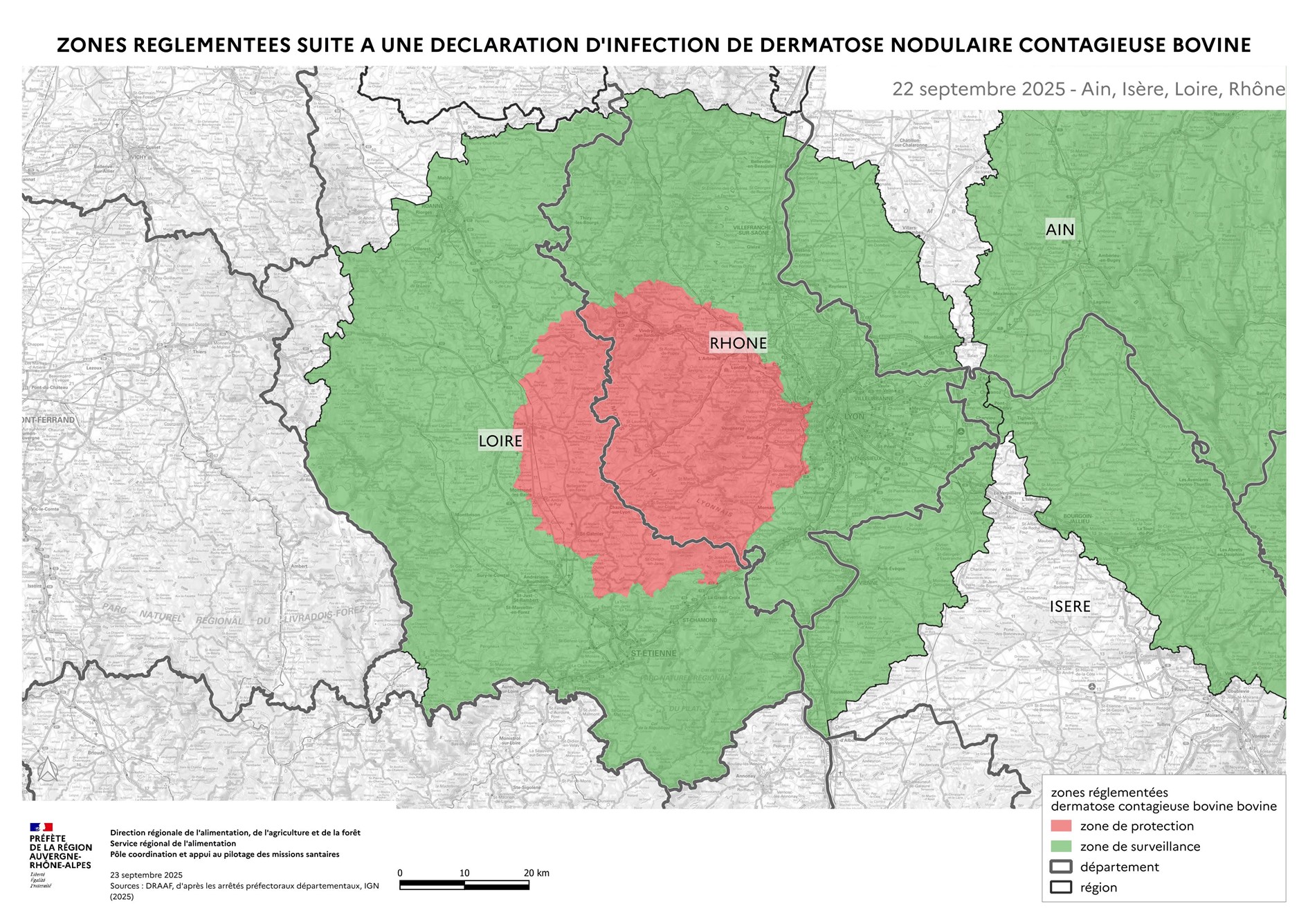 ACTUALITÉS ÉPIDÉMIOLOGIQUES Un premier foyer de DNC (Dermatose Nodulaire Contagieuse) a été déclaré dans un élevage bovin laitier en Savoie, le 29 juin 2025. Afin d'éviter la dissémination de cette maladie, le cheptel est dépeuplé rapidement, étant donné le statut de cette maladie au niveau européen (catégorie A+D+E au niveau de la LSA). A la date du 15/10/2025, 83 foyers ont été mis en évidence dans l'Ain, le Rhône, le Jura, en Savoie et Haute-Savoie, dans 51 élevages (un foyer correspond à une unité/lot d'animaux touchés : il peut donc y avoir plusieurs foyers dans un même élevage). Une zone réglementée d’un rayon de 50 kilomètres est mise en place autour du foyer et instaure des mesures de prévention (surveillance vétérinaire renforcée, vaccination obligatoire), ainsi que des restrictions notamment sur le déplacement des bovins. Ces mesures visent à éviter que la maladie ne se diffuse dans d’autres élevages, en particulier au-delà de cette zone réglementée. ZR1 (foyers Savoie, Haute-Savoie, Ain) : En l'absence de nouveau foyer depuis 28 jours, les communes en zone de protection de la ZR1 sont passées en statut de zone de surveillance, le 04/10/2025. Le 10/10/2025, une zone vaccinale a été mise en place dans 63 communes de Savoie et Haute-Savoie, pour permettre des mouvements vers la zone indemnes, sous conditions. Lire le communiqué de presse en cliquant ici. ![]() ZR2 (Rhône): Le 18/09/2025, un foyer dans un élevage bovin sur la commune de Saint Laurent de Chamousset, dans le Rhône. ![]() ZR3 (Espagne - Occitanie): En Espagne, un premier foyer a été détecté le 01/10/2025 au sein d’un élevage de 123 bovins laitiers, situé dans la commune de Castelló d’Empuries (province de Gérone) à 20 km de la frontière française. Le nombre de foyers espagnol est de 9 élevages, au 16/10/2025.