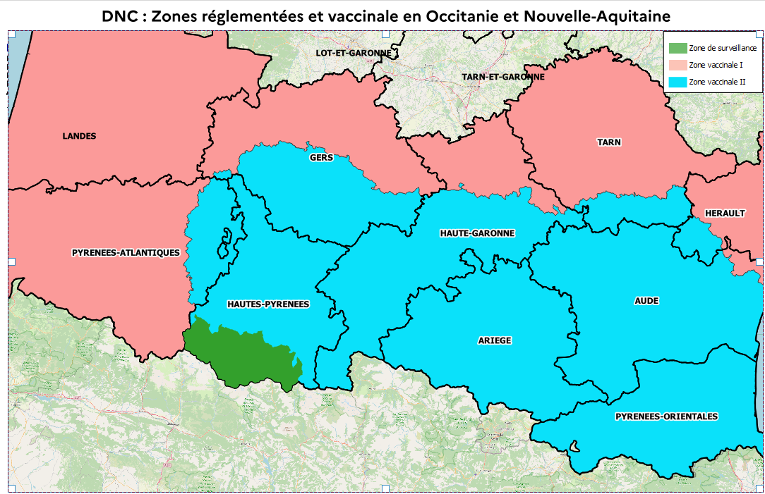 Le Département de l’Agriculture, de l’Élevage et de l’Alimentation du Gouvernement d’Aragon a confirmé le 28/02/26 un foyer de DNC dans une exploitation de 133 bovins allaitants située dans la localité de Borrastre, appartenant à la commune de Fiscal (Huesca). Cet élevage, bien que situé en zone vaccinale, n'était pas vacciné. Le zonage autour de ce foyer englobe une partie du département du 65, dont 26 communes passent en zone de surveillance (ZR8). Un second foyer dans un cheptel de 148 bovins a été détecté dans les jours suivants, là encore avec une vaccination inachevée du tropupeau, et sans impact sur le zonage réglementé en France.