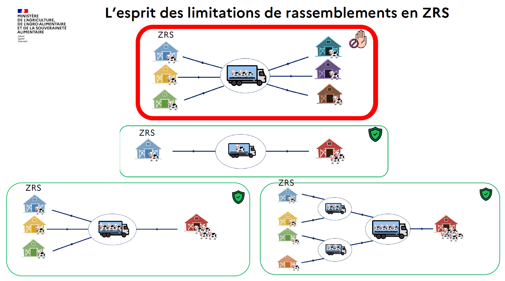 → Réouverture des centres de rassemblement en ZRS (hors ZS et ZP) de bovins vivants, avec surveillance renforcée (supervision d’un vétérinaire) et déclaration de la date de reprise auprès de la DDPP.