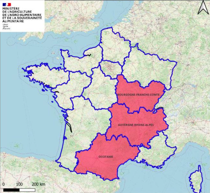 - Interdiction, dans l’ensemble des régions comprenant une zone réglementée - à savoir l’Auvergne-Rhône-Alpes, la Bourgogne-Franche-Comté et l’Occitanie - des marchés de bovins destinés à l’élevage ;