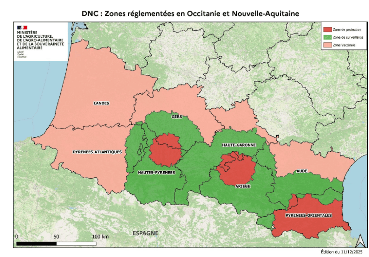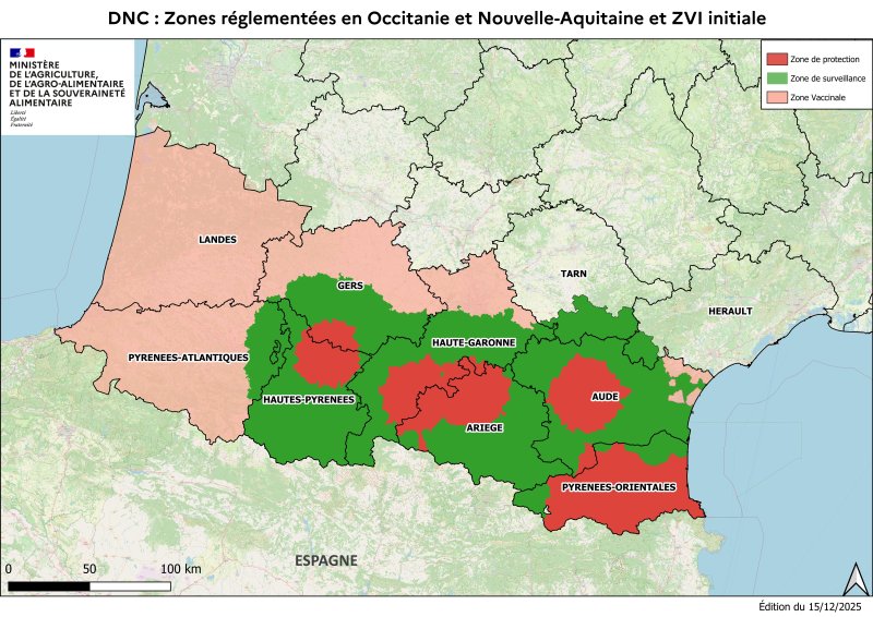 - Outre les communes déjà situées en Zone règlementée, la vaccination est rendue obligatoire dans les autres communes des départements de l'Aude, de la Haute-Garonne, du Gers, des Landes et des Pyrénées-Atlantiques + interdiction de sortie de cette zone