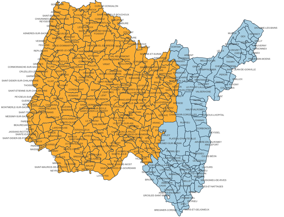 L'Ain est désormais couvert par la Zones Réglementée n°5 (ZR5 - Neuville les Dames) qui vient se supperposé à la Zone Vaccinale n°1 (Ancienne ZR1 - Zone initiale Savoie Ain) :