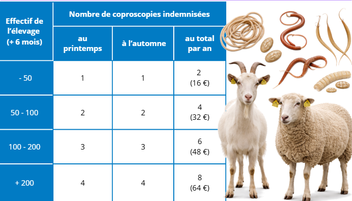 Le nombre de coproscopies prises en charge dépend de l'effectif de l'élevage. Vous trouverez le détail dans le tableau ci-dessous.