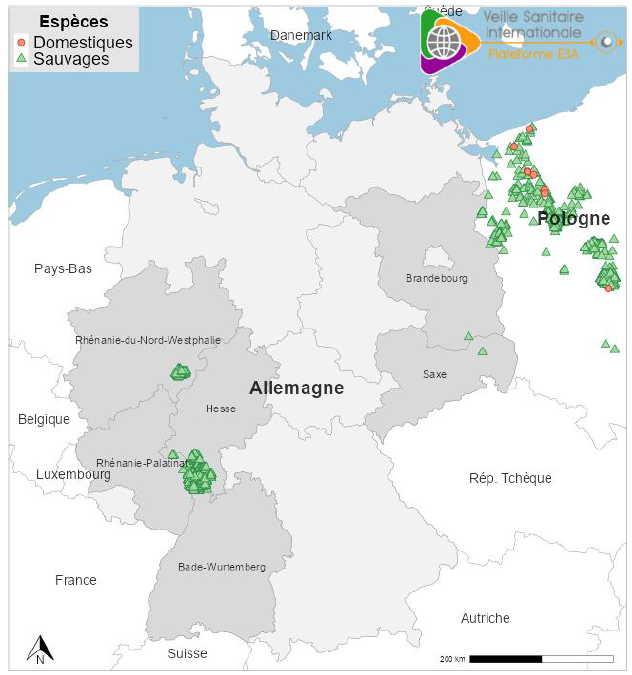 Allemagne : De nombreux foyers sauvages : 1 879 foyers sauvages en 2025. Les cas les plus proches sont à 80 km de la frontière française.