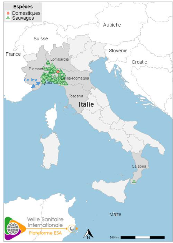 Italie : forte incidence dans la faune sauvage dans le nord du pays. Au total, en 2025, 565 foyers sauvages et 1 foyer en élevage. Les cas les plus proches sont à 60 km de la frontière française.