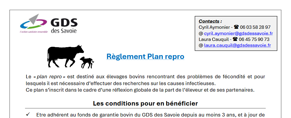Le plan repro du GDS des Savoie est destiné aux élevages bovins rencontrant des problèmes de fécondité et pour lesquels il est nécessaire d’effectuer des recherches sur les causes infectieuses.