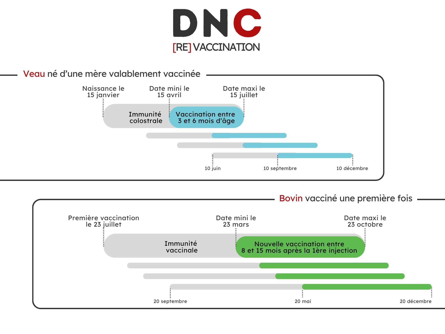 Vous trouverez au lien suivant DNC – Fenêtre de [Re]vaccination une calculette qui vous permettra d'identifier précisémenet la fenêtre de revaccination de vos bovins (si vous vaccinez par lot, renseigner la date du dernier bovin vacciné)